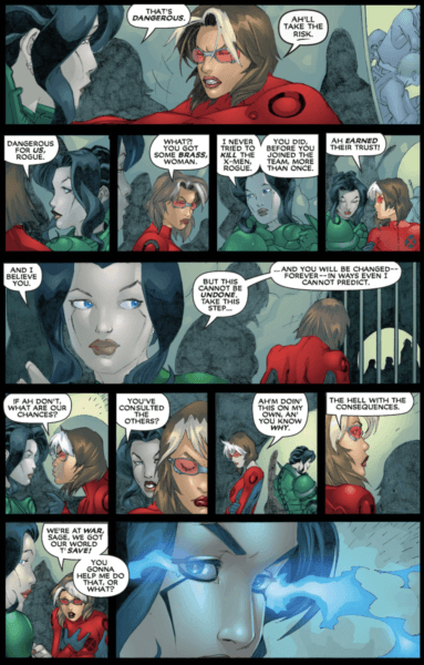It is thanks to Sage that Rogue, during this time, can recall and mix and match powers she has previously absorbed, at will. So we get to see her with Colossus armoured skin, Wolverine claws and Cyclops eye blasts all at once. It is very cool but also very OP, so I can see why the story led to Rogue and Gambit both being depowered. This storyline was the reason I picked up this run, as it gives the two of them time to go and try to live normal lives. It is at this point that Rogue also starts going by Anna Raven. This is really cute. I loved seeing them be a happy couple!
