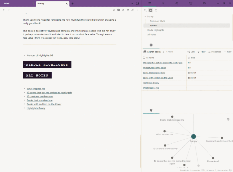 And then a section at the bottom where I embed my multi-purpose bases to show any other notes that are linked to this one. This could be Kindle Highlights – these I add into Obsidian using the Kindle Highlights plugin from my clippings file (now I side-load my Kindle with ePubs!) – or things like notes for Top Ten Tuesday lists. To do that, all you need in the filter is: file.hasLink(this).