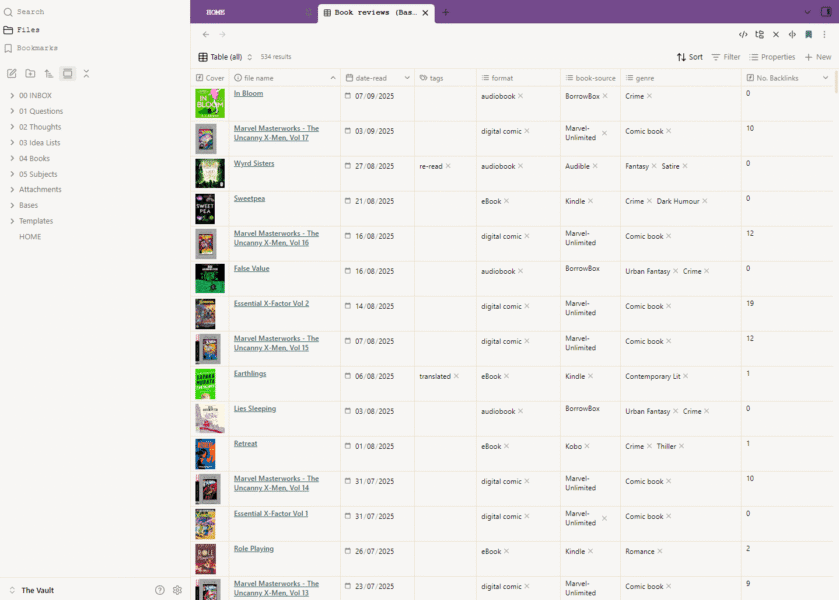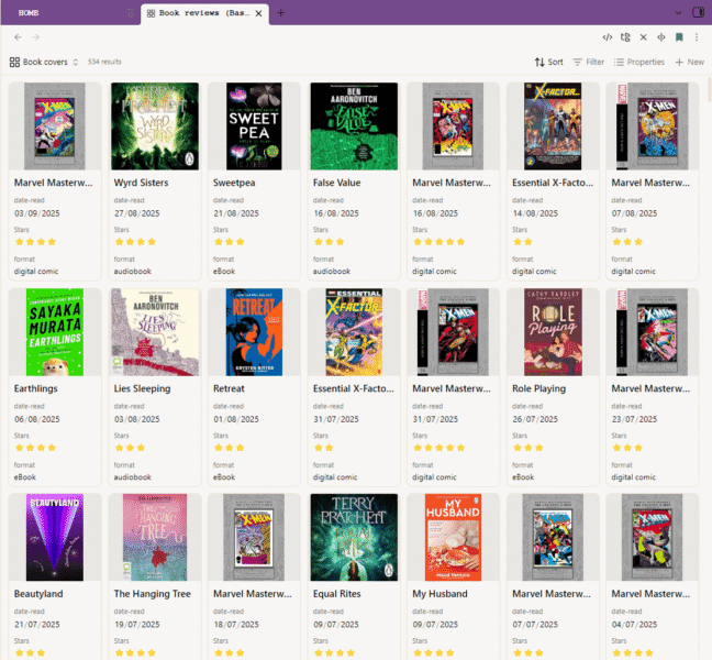 There has been a community plugin called Dataview around for a long time, and in the past, this is how I’d been able to query notes to do lots of useful things to build displayable connections (e.g, in a note I might have for an author, to list all my reviews for books I’ve read by them). Bases replaces and improves some of those functions, but it can’t (yet) do everything that Dataview can, so you will see I’m still using both.