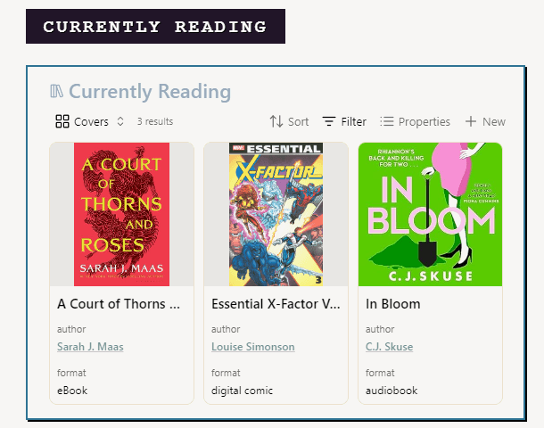 I am a little mortified that I happen to be reading A Court of Thorns and Roses right now, and so it’s getting “immortalised” in this blog post. But it does mean using it as a pilot book for this new workflow and testing using a reading log. I am keeping a great record of all the things I hate about it! (I am not enjoying reading this book (Romantasy is not my thing); I’m only reading it to discuss with my Husband, who just read it for a personal project).