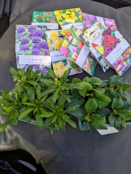 Wallflowers, polyanthus and lots of bulbs.