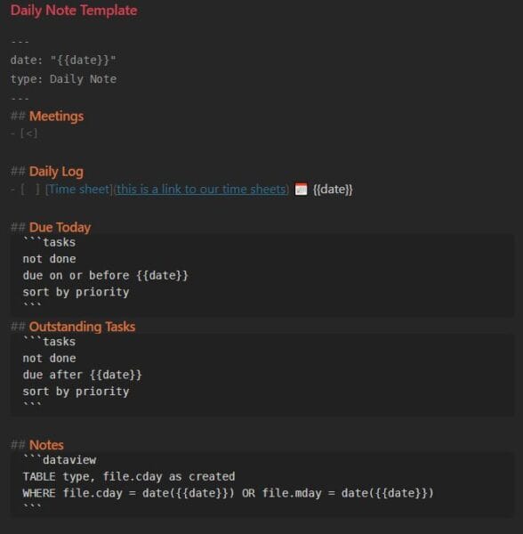 Then I use a heading for a Daily Log for quick notes, brain dumps and adding general tasks on the fly. This is my “bullet journal” or “rapid logging” section – how much I use this really varies depending on my mood and what I have on. In my template for my Daily Note I also keep a preloaded task to remind me to fill in my timesheet at the end of each day with links to the system so its just a click away!
